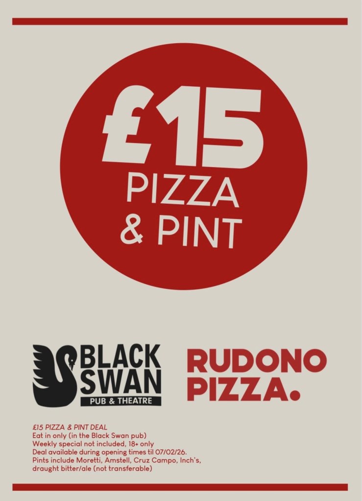 We’re based at the Tack Shed, adjoined to the theatre and opposite the Black Swan Pub (where you can enjoy pizza inside or grab a drink while you wait)
